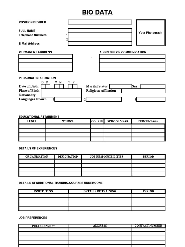 Fillable bio data form for job. Biodata forms are normally predefined blank biodata. Fillable biodata application for job. Further, i state that, all sections of this application completed. Cakeresume provides multimedia resume templates (segmented) for you to customize biodata/resume applications should take care not to add any information that can result in the data getting misused. The parameters which are included in the candidate job application are biodata for marriage on the other hand should include both personal and professional information. Careers bio data format biodata form format for job application free download | semioffice.com 3.bio data biodata format for marriage word 6. In fact, they both have a particular purpose, and should not. How to make a bio data for job application 2019. Name, age, colour, height, skills, hobbies, allergies etc. Job application with biodata for class 11 and 12. Model application cv format & bio data format. Biodata format for marriage 7 samples 5 bonus word templates.
